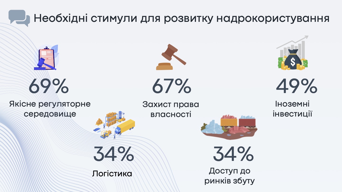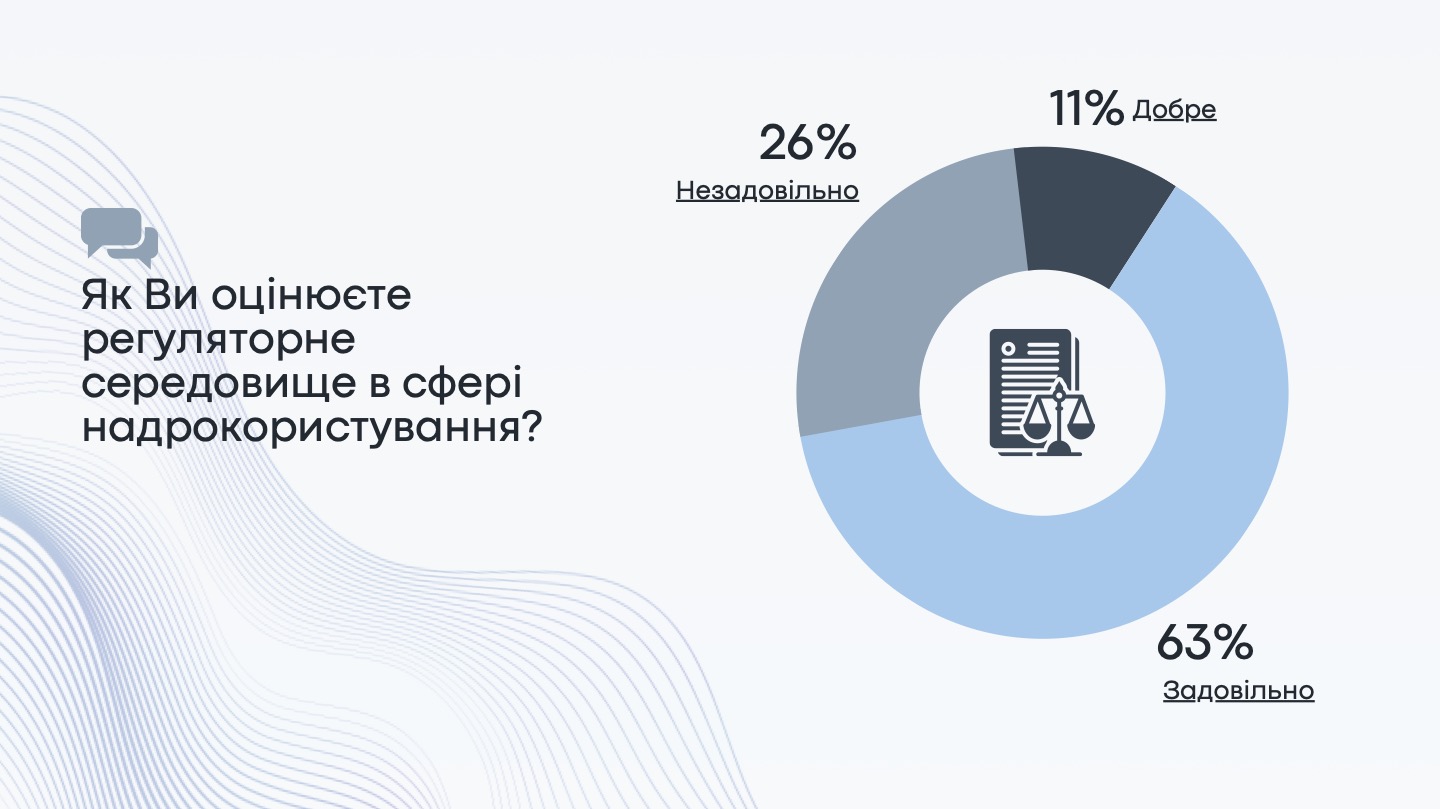 Регуляторне середовище в сфері надрокористування більшість підприємств, а саме 63% оцінюють задовільно, а 11% – добре. Водночас 26% вважають його незадовільним. Реформа сфери надрокористування отримала оцінку 6,26 за 10-бальною шкалою від підприємців. Водночас якісне регуляторне середовище, захист права власності, іноземні інвестиції могли б вже зараз стимулювати розвиток сфери.