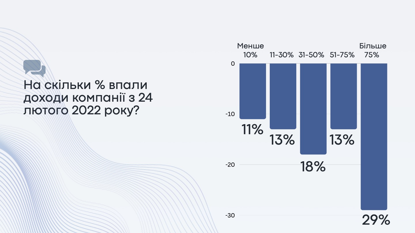 З 24 лютого 2022 року не зазнали змін доходи тільки 16% компаній, усі інші відчули падіння доходів. Зокрема, 42% повідомили про падіння до 50% від доходів, 13% – про падіння 50-75%, і 29% – про падіння більше 75%.