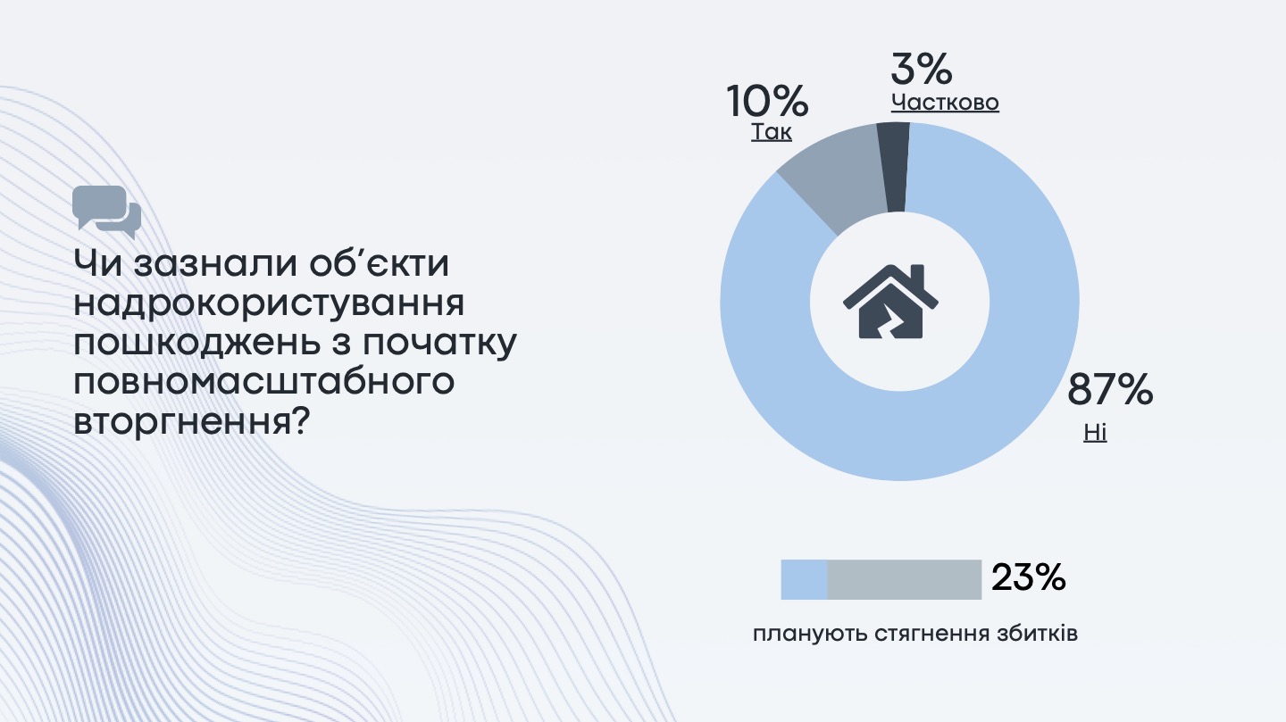 У 13% бізнесів об’єкти надрокористування зазнали різного роду пошкоджень з початку повномасштабного вторгнення, а у 18% є об’єкти на окупованих або деокупованих територіях. При цьому 23% компаній планують стягнення збитків за завдану шкоду активам.