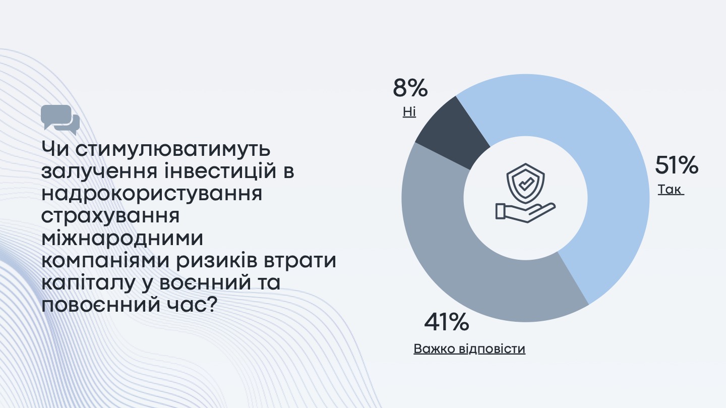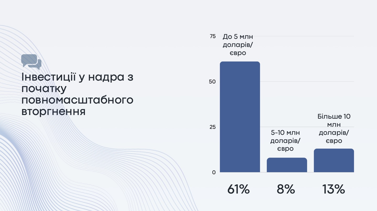 Більшість компаній, а саме 61% з початку повномасштабного вторгнення інвестували до 5 млн доларів/євро в українські надра, а 21% інвестували понад 5 млн доларів/євро. Високі ризики для міжнародного інвестування разом з проблемами з енергопостачанням та труднощами з логістикою (відсутність доступу до портів та ускладнення залізничного перевезення) бізнес відносить до топ-3 викликів воєнного часу. Водночас 51% опитаних погоджуються, що страхування міжнародними компаніями (DFC/MIGA тощо) ризиків втрати капіталу у воєнний та повоєнний час стимулюватимуть залучення інвестицій в надрокористування.