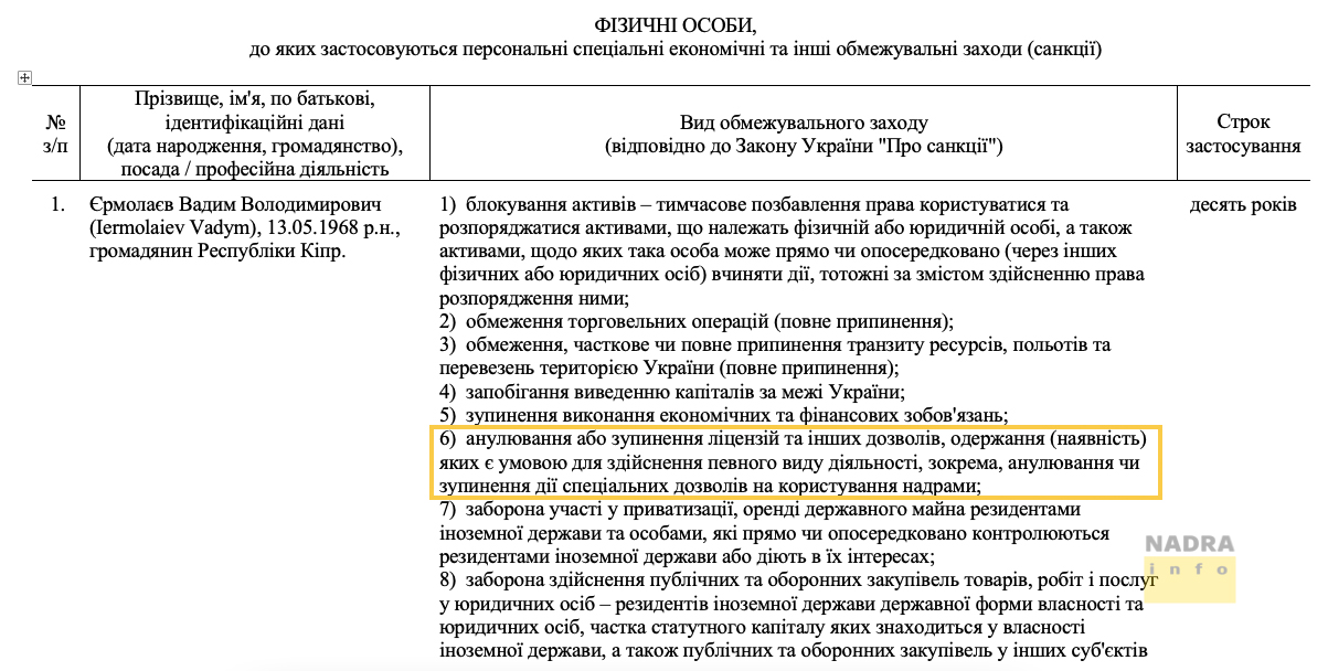 Перелік застосованих до Єрмолаєва санкцій РНБО включає зокрема «… анулювання чи зупинення дії спеціальних дозволів на користування надрами»: