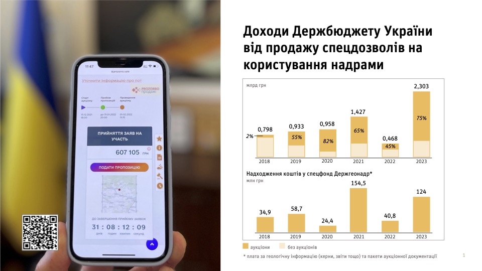 Крім цього, за даними Держгеонадр, в 2023 р. до спецфонду Служби надійшло 124 млн грн (плата за геологічну інформацію (керни, звіти тощо) та пакети аукціонної документації):