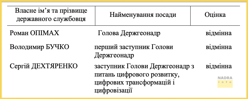 Кабінет Міністрів України оприлюднив висновки щодо оцінювання результатів службової діяльності у 2023 році Голови Державної служби геології та надр України Романа Опімаха. Також в Уряді оцінили результати діяльності першого заступника Голови Держгеонадр Володимира Бучка і заступника Голови Держгеонадр з питань цифрового розвитку, цифрових трансформацій і цифровізації Сергія Дехтяренка. Повідомляє ІА NADRA.INFO із посиланням на розпорядження Кабінету Міністрів України від 15 грудня 2023 р. №1144-р із додатками (завантажити).