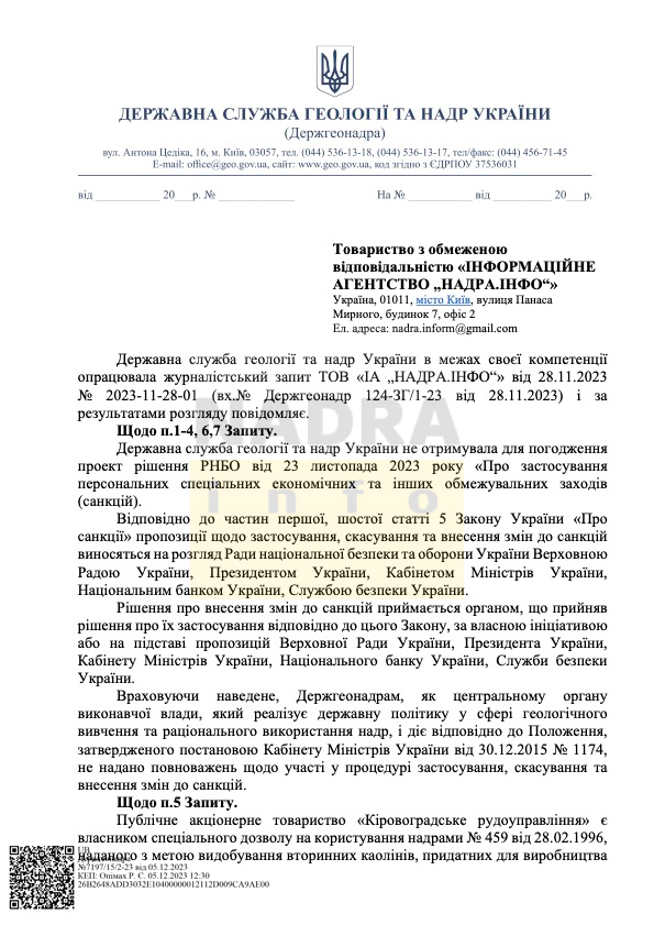 Звернутися до Держгеонадр NADRA.INFO вирішили після того, як Президент України Володимир Зеленський Указом від 23 листопада 2023 року №773/2023 ввів в дію рішення РНБО про застосування санкцій до двох громадян РФ, які є кінцевими бенефіціарними власниками (КБВ) українських видобувних компаній: