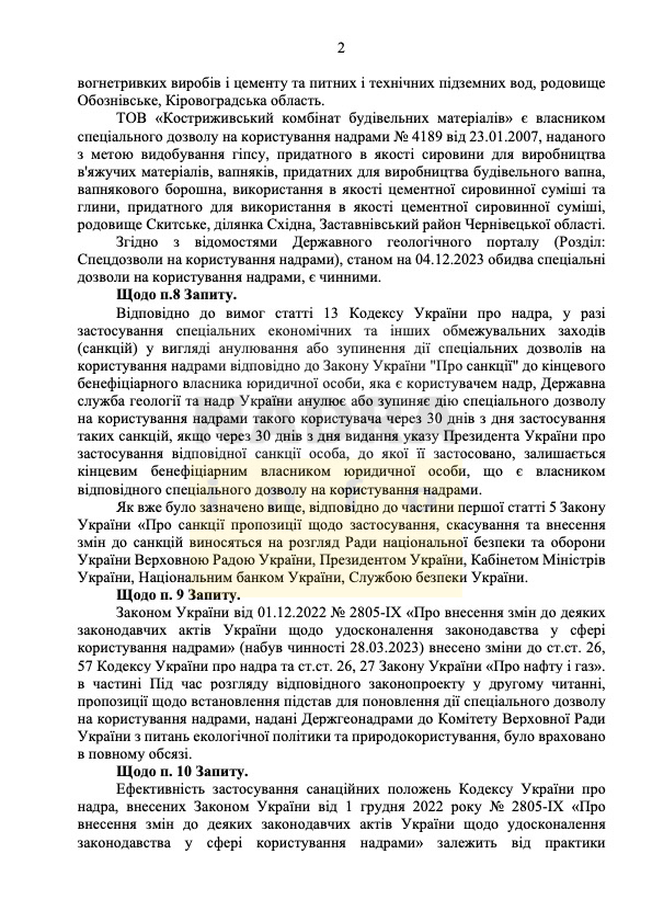 Що стосується поточного статусу спецдозволів Кіровоградського РУ і Кострижівського КБМ, в Держгеонадрах заявили, що «Згідно з відомостями Державного геологічного порталу (Розділ: Спецдозволи на користування надрами), станом на 04.12.2023 обидва спеціальні дозволи на користування надрами, є чинними». І нагадали, що «відповідно до вимог статті 13 Кодексу України про надра, у разі застосування спеціальних економічних та інших обмежувальних заходів (санкцій) у вигляді анулювання або зупинення дії спеціальних дозволів на користування надрами відповідно до Закону України “Про санкції” до кінцевого бенефіціарного власника юридичної особи, яка є користувачем надр, Державна служба геології та надр України анулює або зупиняє дію спеціального дозволу на користування надрами такого користувача через 30 днів з дня застосування таких санкцій, якщо через 30 днів з дня видання указу Президента України про застосування відповідної санкції особа, до якої її застосовано, залишається кінцевим бенефіціарним власником юридичної особи, що є власником відповідного спеціального дозволу на користування надрами».