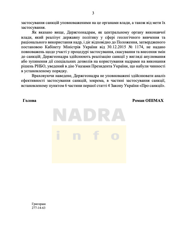 Враховуючи наведене, Держгеонадра не уповноважені здійснювати аналіз ефективності застосування санкцій, зокрема, в частині застосування санкції, встановленому пунктом 6 частини першої статті 4 Закону України «Про санкції», – заявили в Держгеонадрах.