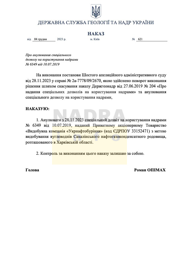 Зауважимо, Укрнафтобуріння зупинило видобування газу на Сахалінському родовищі 01.12.2023, не чекаючи на наказ про анулювання спецдозволу.