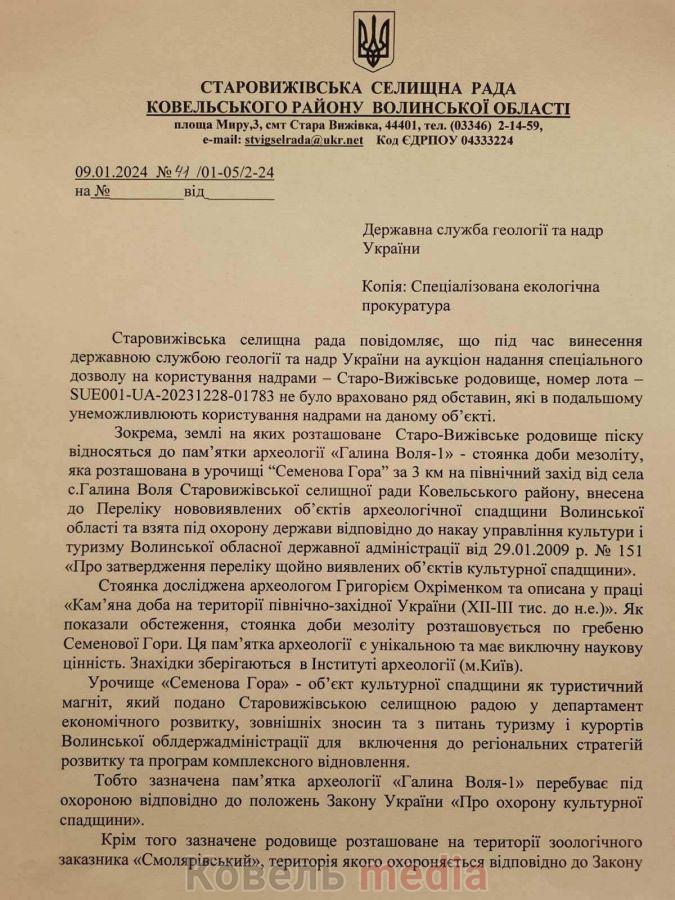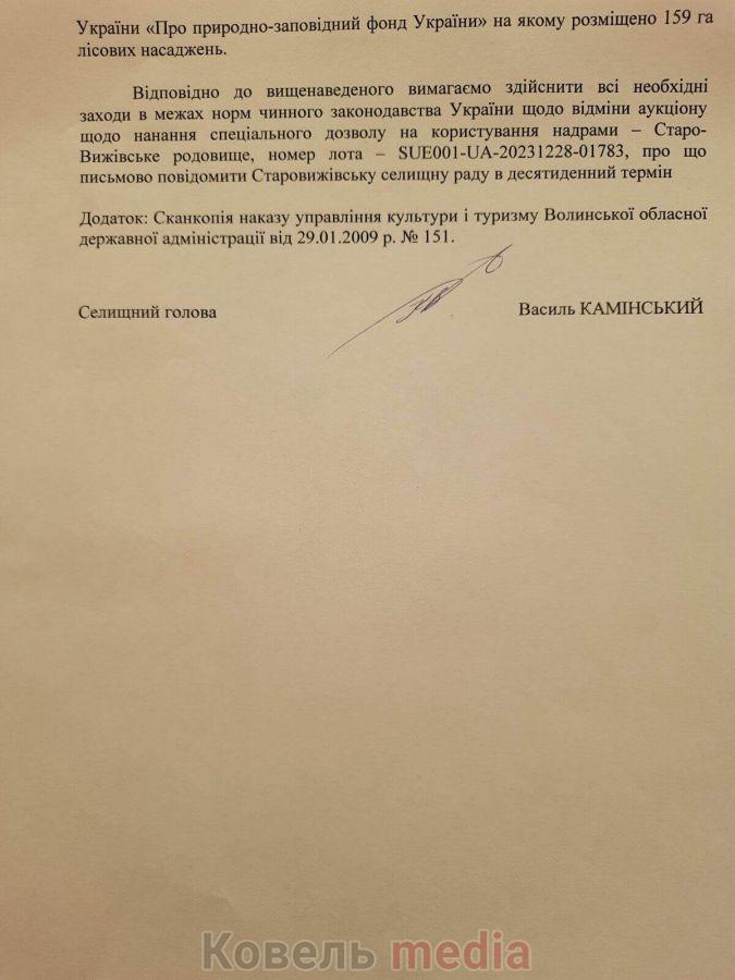 Є також відповідне звернення Старовижівського селищного голови Василя Камінського від 9 січня 2024 року до Спеціалізованої екологічної прокуратури та Державної служби геології та надр України, яка все ж таки провела скандальний аукціон: