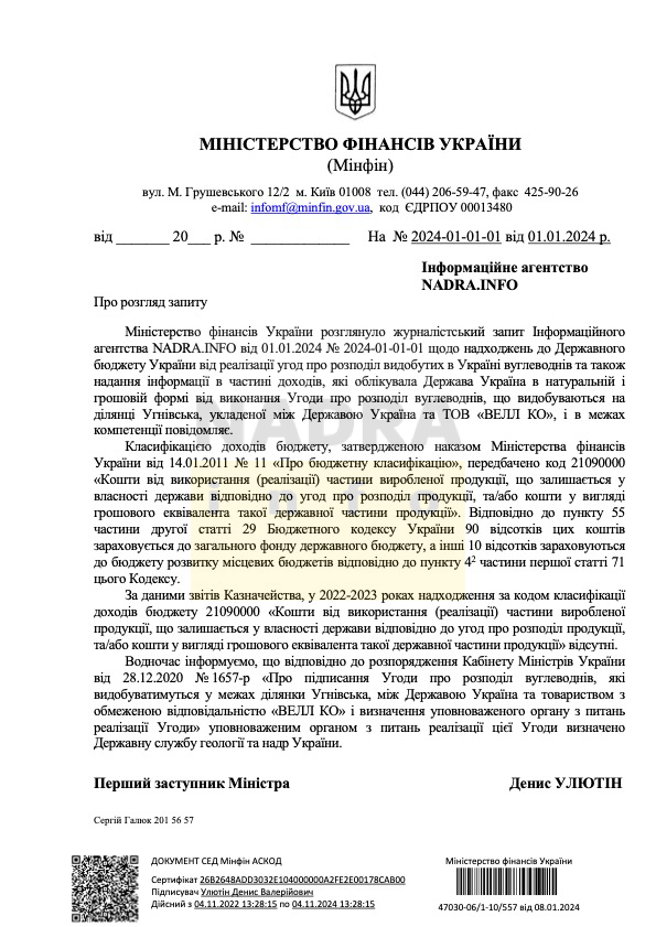 В 2022-2023 роках Державний бюджет України не отримав доходу від реалізації Угоди про розподіл вуглеводнів, які видобуваються на ділянці Угнівська. Про таке NADRA.INFO повідомив Перший заступник Міністра фінансів України Денис Улютін у відповідь на запит: