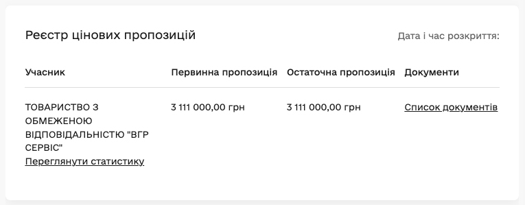 Місцеве ТОВ «ВГР Сервіс» (YouControl) запропонувало за лот 3 111 000 грн: