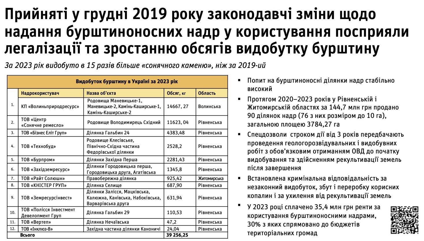 Видобувачами бурштину в 2023 р. були (зазначено річні обсяги видобутку, за даними Держгеонадр):