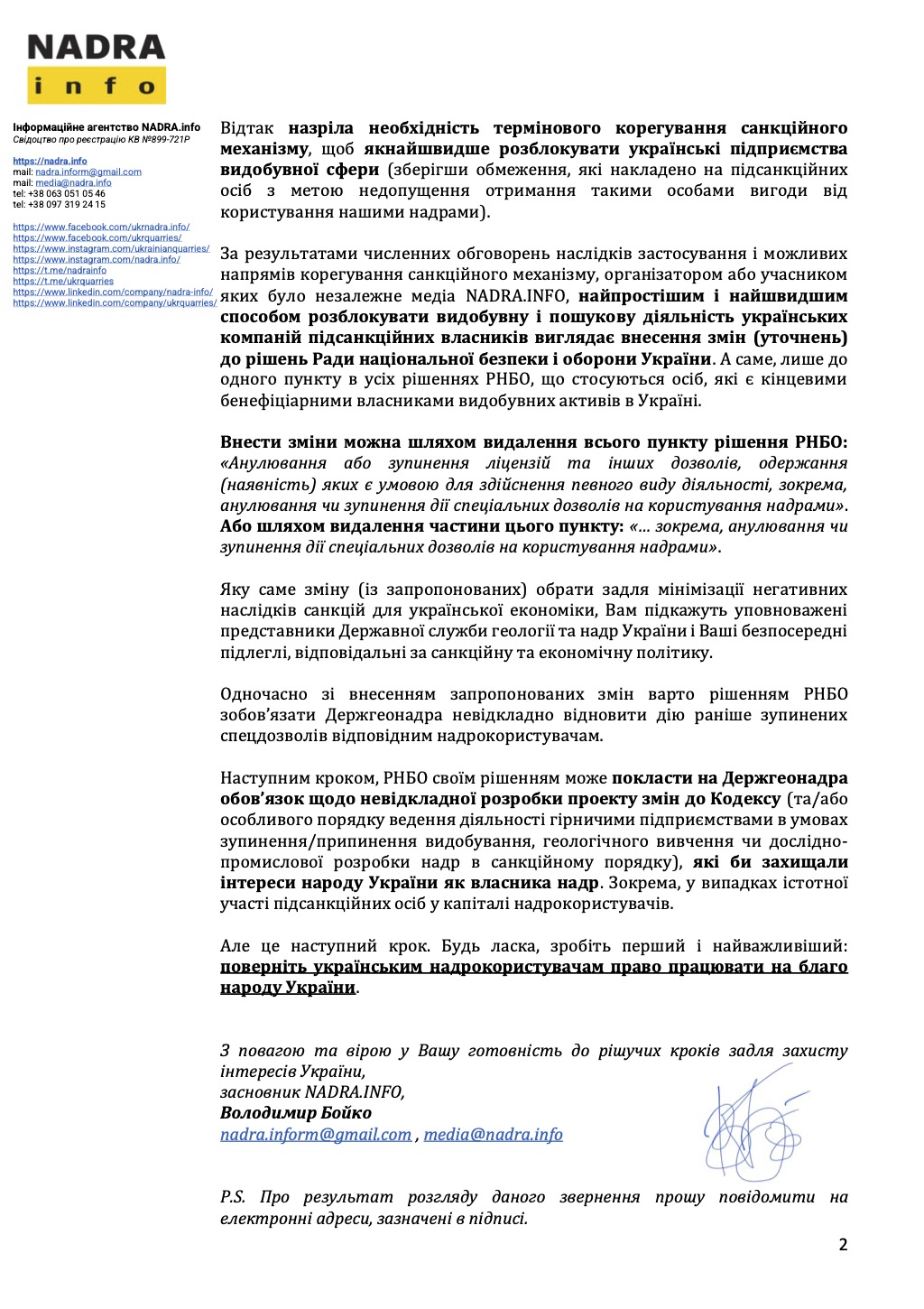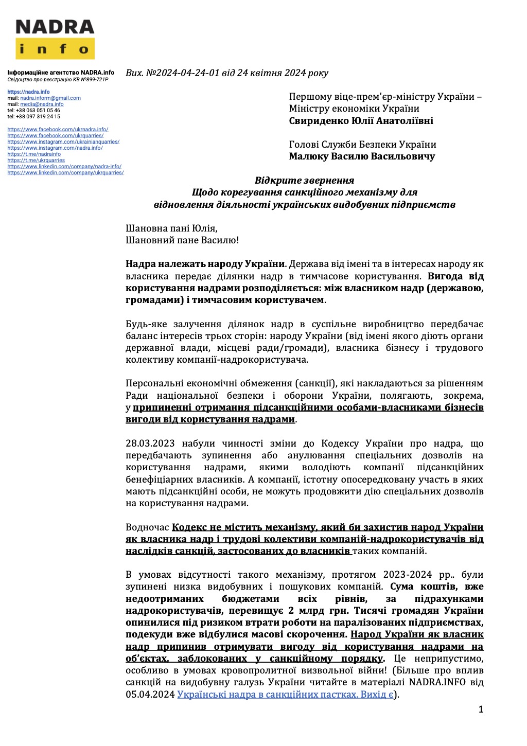 В середу, 24.04.2024 засновник Інформаційного агентства NADRA.INFO Володимир Бойко звернувся до Першого віце-прем’єр-міністра України–Міністра економіки України Юлії Свириденко та Голови Служби безпеки України Василя Малюка із відкритим звернення щодо корегування санкційного механізму для відновлення діяльності українських видобувних підприємств (сканкопію дивіться нижче):