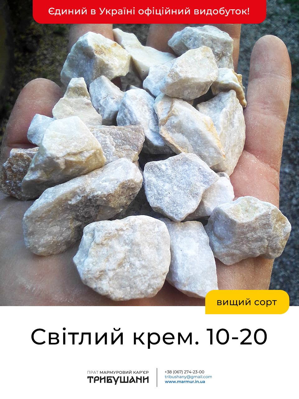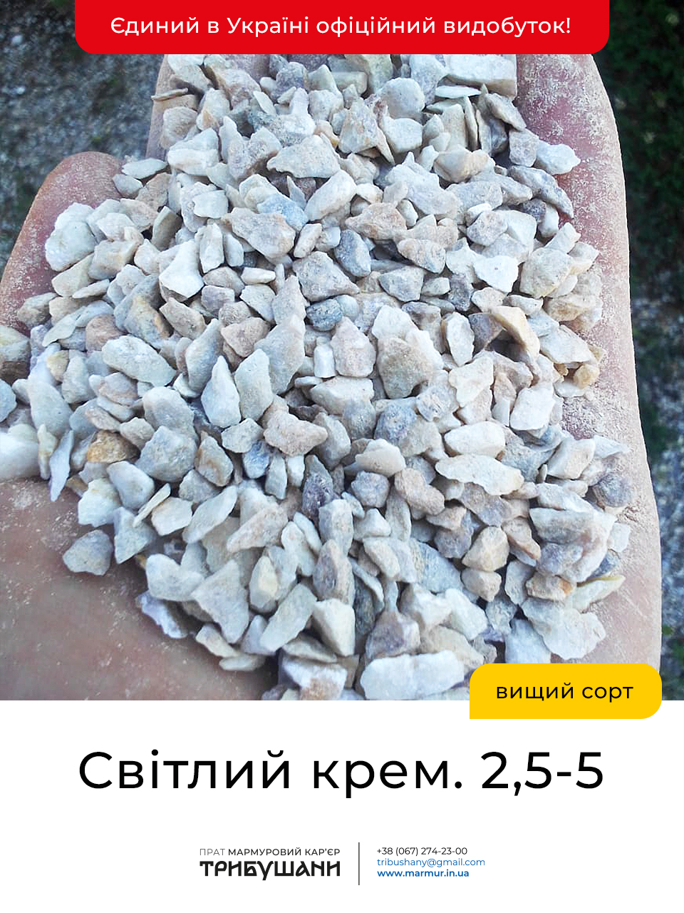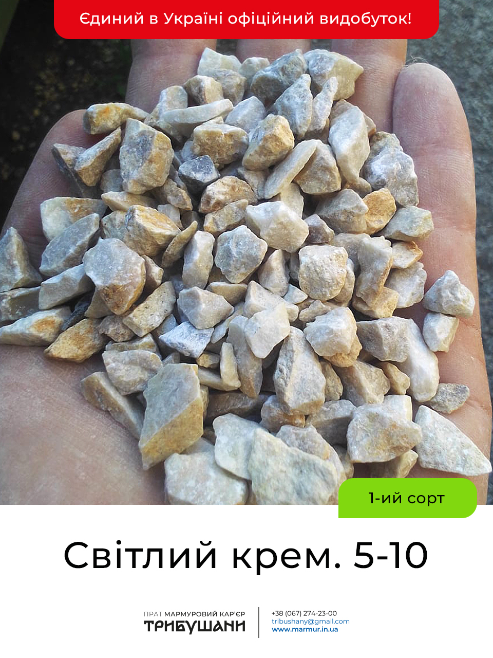 - Мармуровий щебінь (традиційна продукція різних кольорів та фракції від 5 до 20 мм);