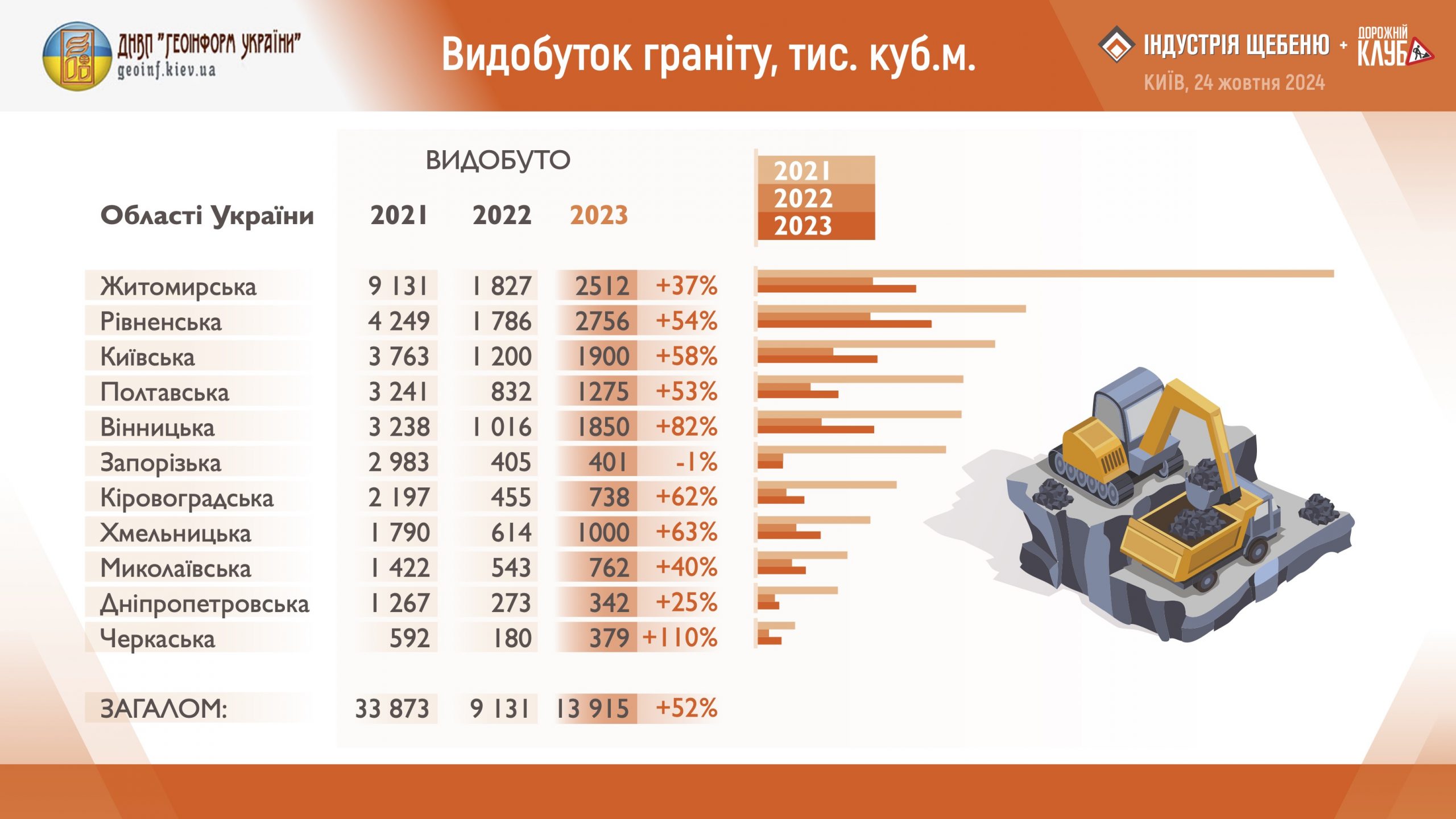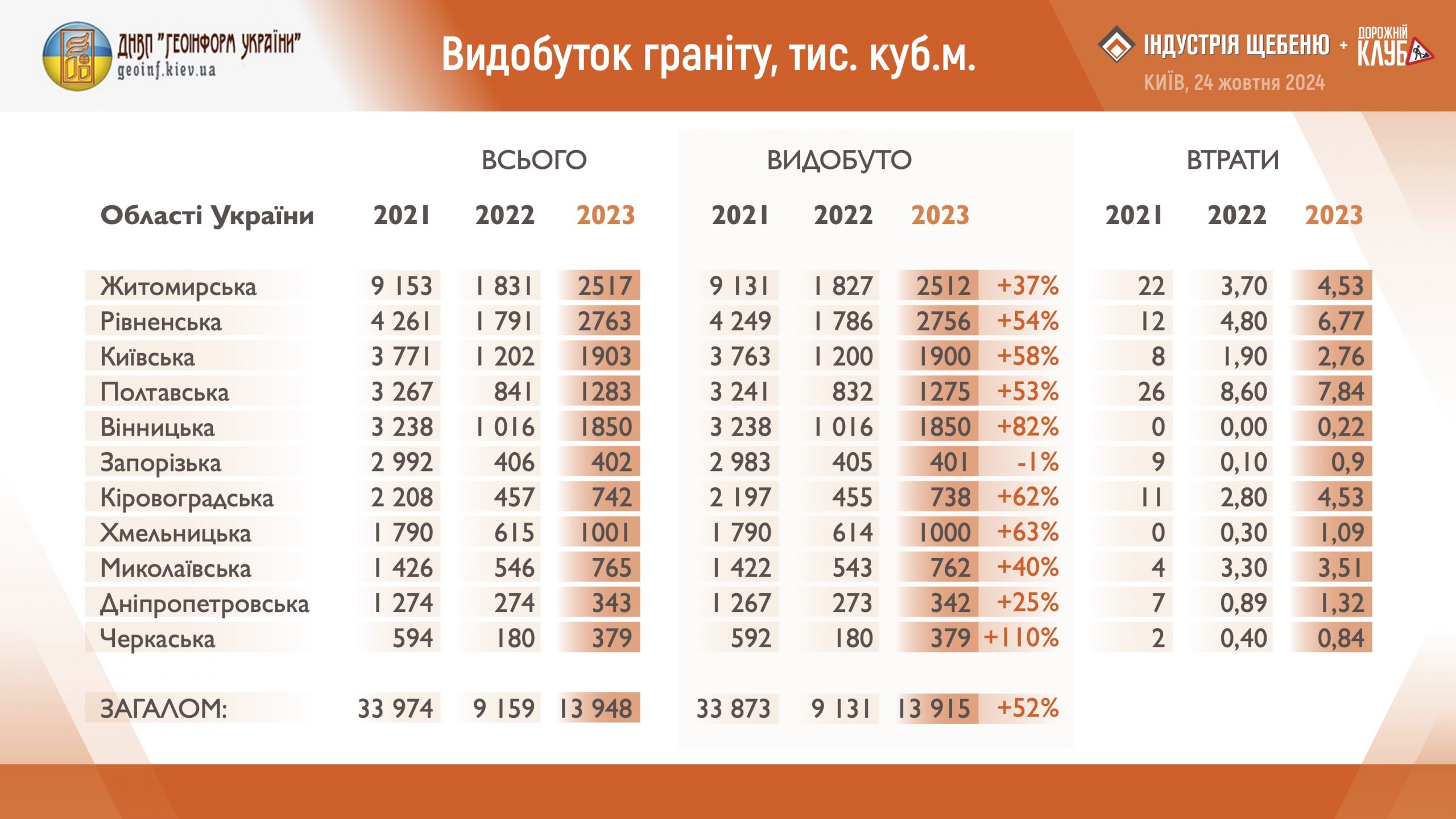 За підсумками 2023 р. (у порівнянні з 2022 р.) видобуток гранітів в Україні зріс на 52%. Такі дані ДНВП «Геоінформ України» під час спільної конференції інфраструктурної, видобувної та дорожньо-будівельної галузі України «Індустрія щебеню» та «Дорожній клуб» оприлюднив куратор проекту Валерій Берлет.