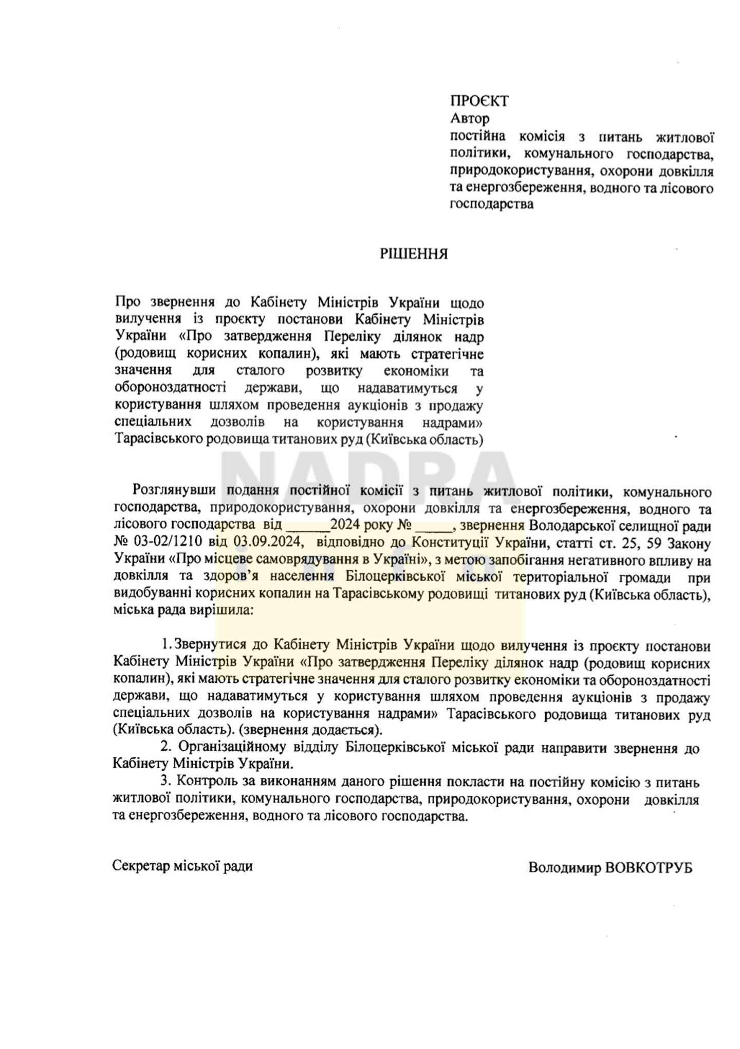 Депутати Білоцерківської міської ради просять Кабінет Міністрів України вилучити родовище розсипних циркон-рутил-ільменітових руд Тарасівське із проекту переліку 100 ділянок стратегічних надр, які надаватимуться в користування через аукціони. Повідомляє NADRA.INFO.