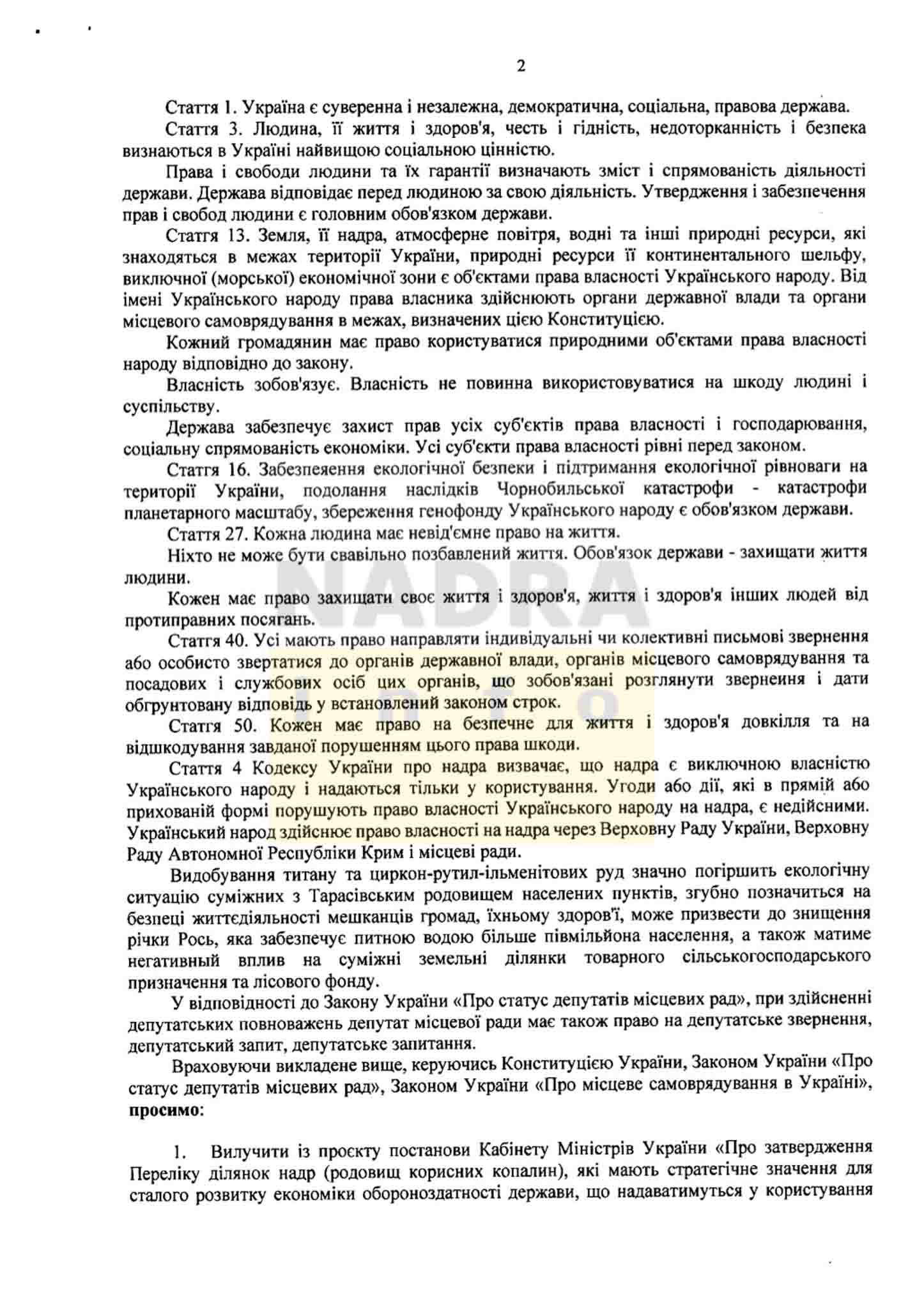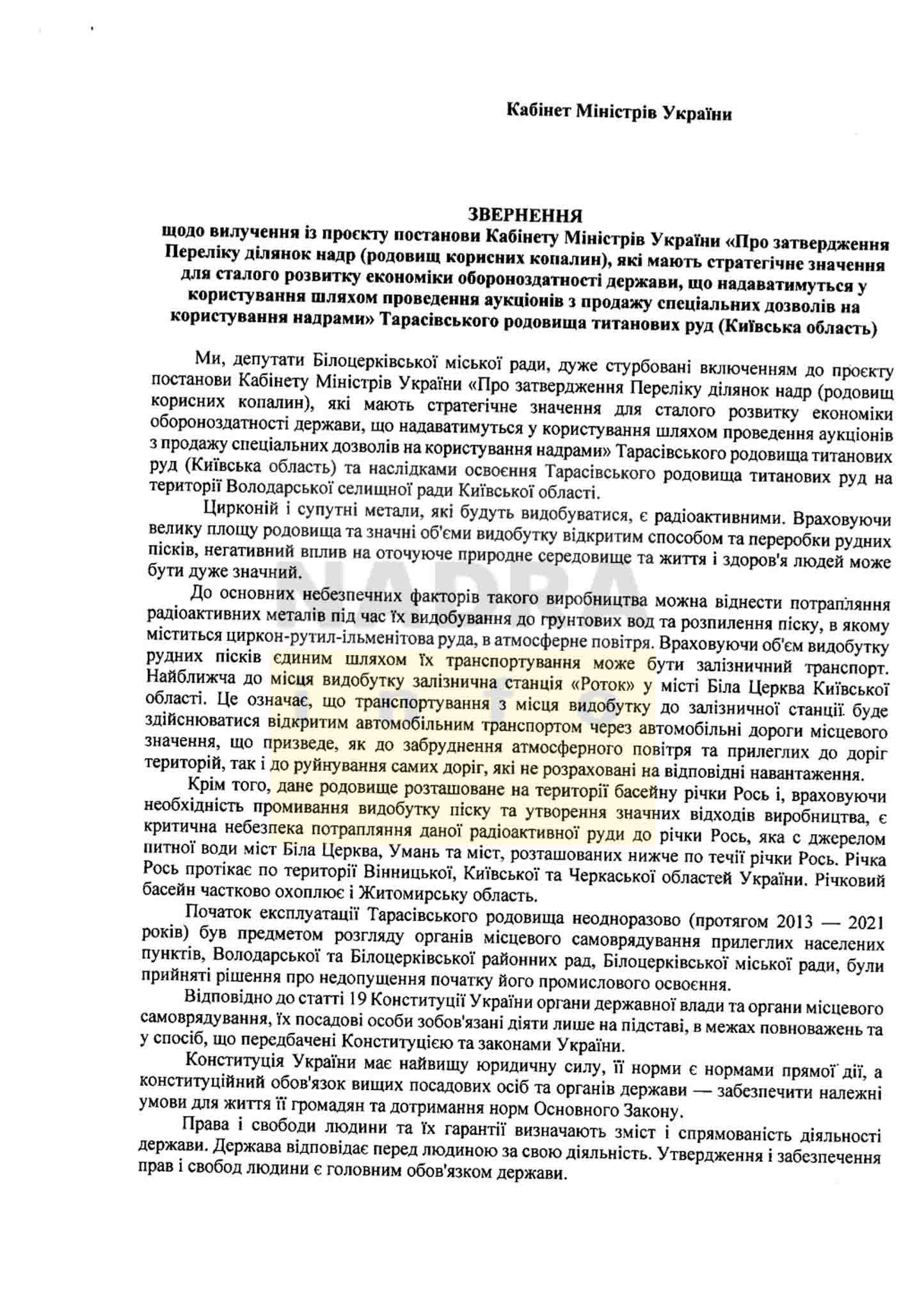 «Видобування титану та циркон-рутил-ільменітових руд значно погіршить екологічну ситуацію суміжних з Тарасівським родовищем населених пунктів, згубно позначиться на безпеці життєдіяльності мешканців громад, їхньому здоровʼї, може призвести до знищення річки Рось, яка забезпечує питною водою більше півмільйона населення, а також матиме негативний вплив на суміжні ділянки товарного сільськогосподарського призначення та лісового фонду», – йдеться в проекті звернення: