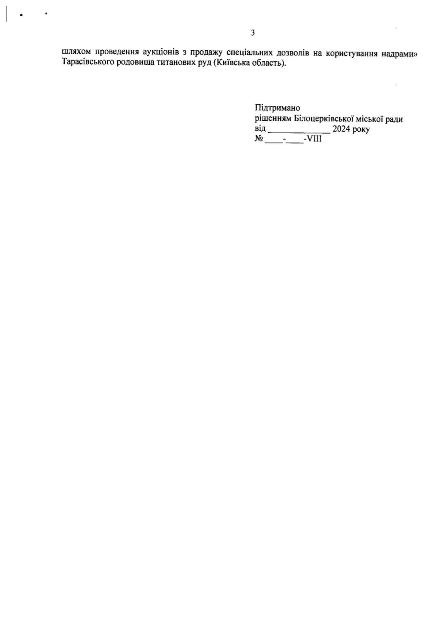 Рішення звернутися до Уряду міська рада Білої Церкви ухвалила 31.10.2024 під час 64 сесії 8 скликання. Прохання не допустити передачу в користування і розробку Тарасівського родовища підтримали всі присутні в засіданні депутати (в дужках – приналежність до фракції або партії, джерело):