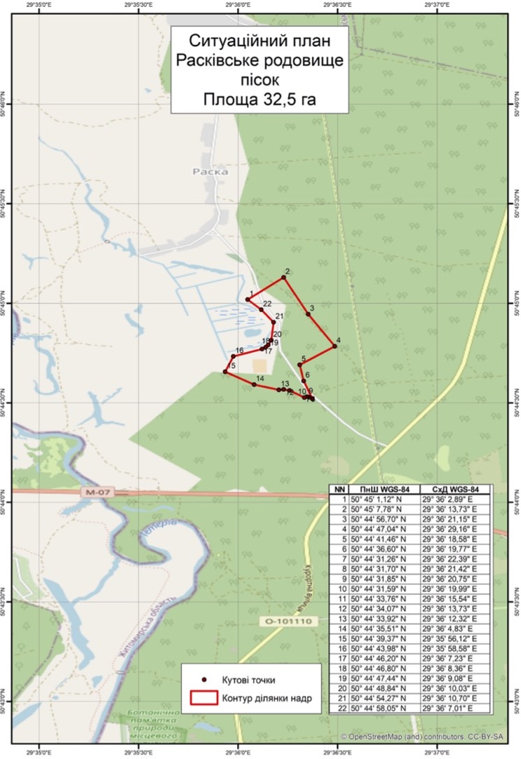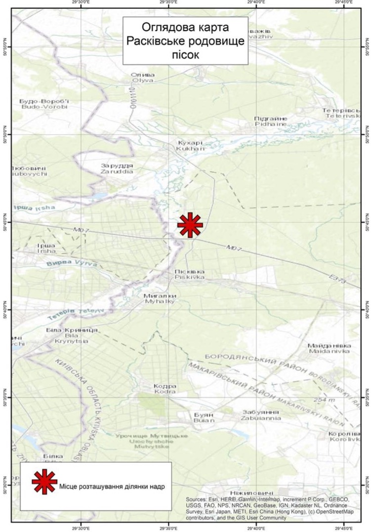 Расківське родовище піску знаходиться в Київській обл. неподалік межі з Житомирською обл. та автошляху М 07 «Київ — Ковель — КПП «Ягодин» («Варшавська траса»). Площа родовища – 32,5 га. Запаси піску будівельного (станом на 01.01.2023) 8 608 тис. м3 (кат. А+В+С1). Джерело ілюстрацій – Prozorro.Sale.
