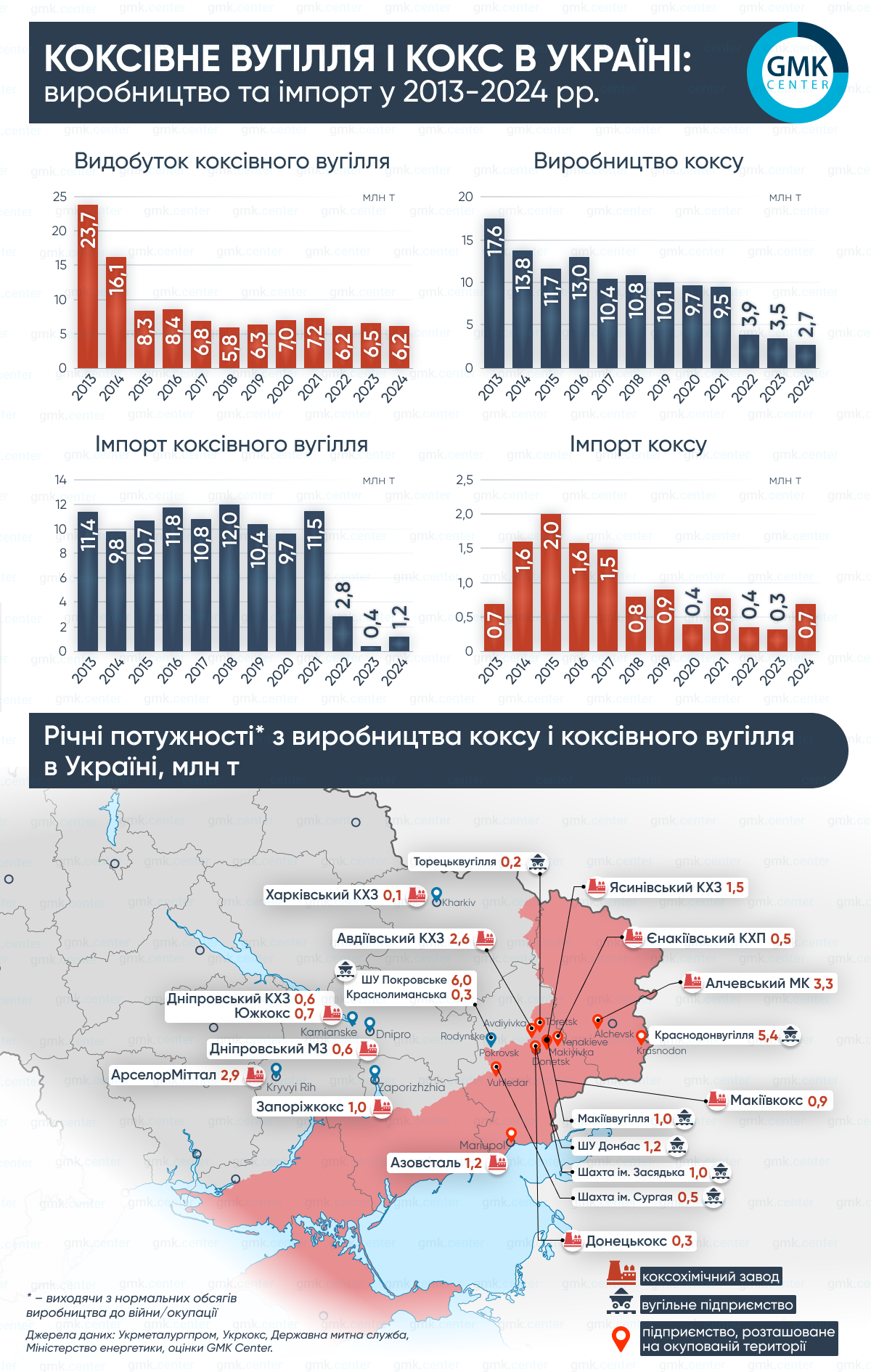 Як повідомляє GMK Center*, з 2013 р. по 2024 р. видобуток коксівного вугілля в Україні скоротився на 74%, а виробництво коксу – майже на 85%. Імпорт коксівного вугілля за вказаний період знизився на 89% у зв’язку зі скороченням виробництва сталі, а імпорт коксу повернувся на рівень 2013 р. (інфографіку GMK Center див. нижче).