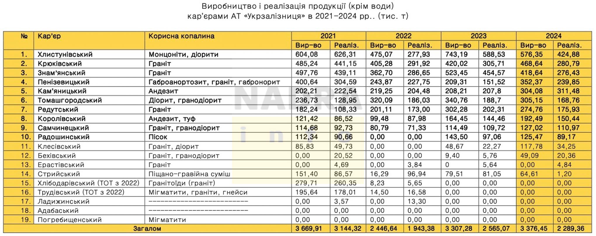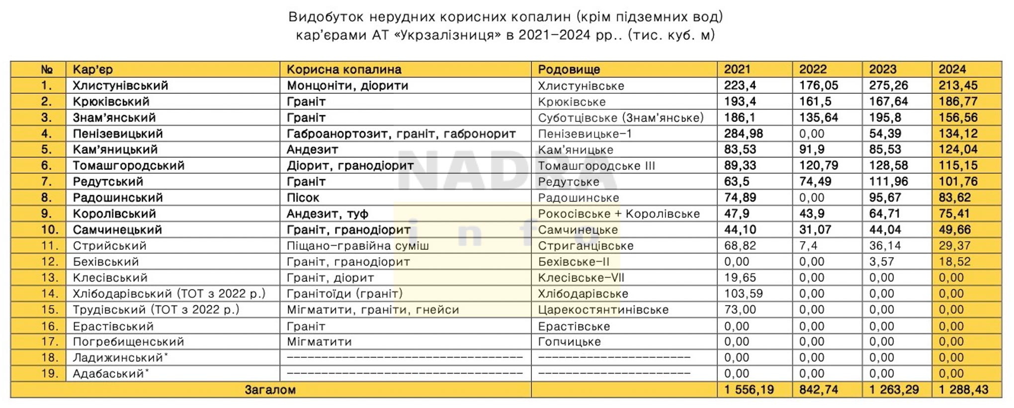 Про обсяги видобутку, виробництва і реалізації продукції карʼєрами Укрзалізниці в 2021-2024 рр.. читайте за посиланням, дивіться в таблицях: