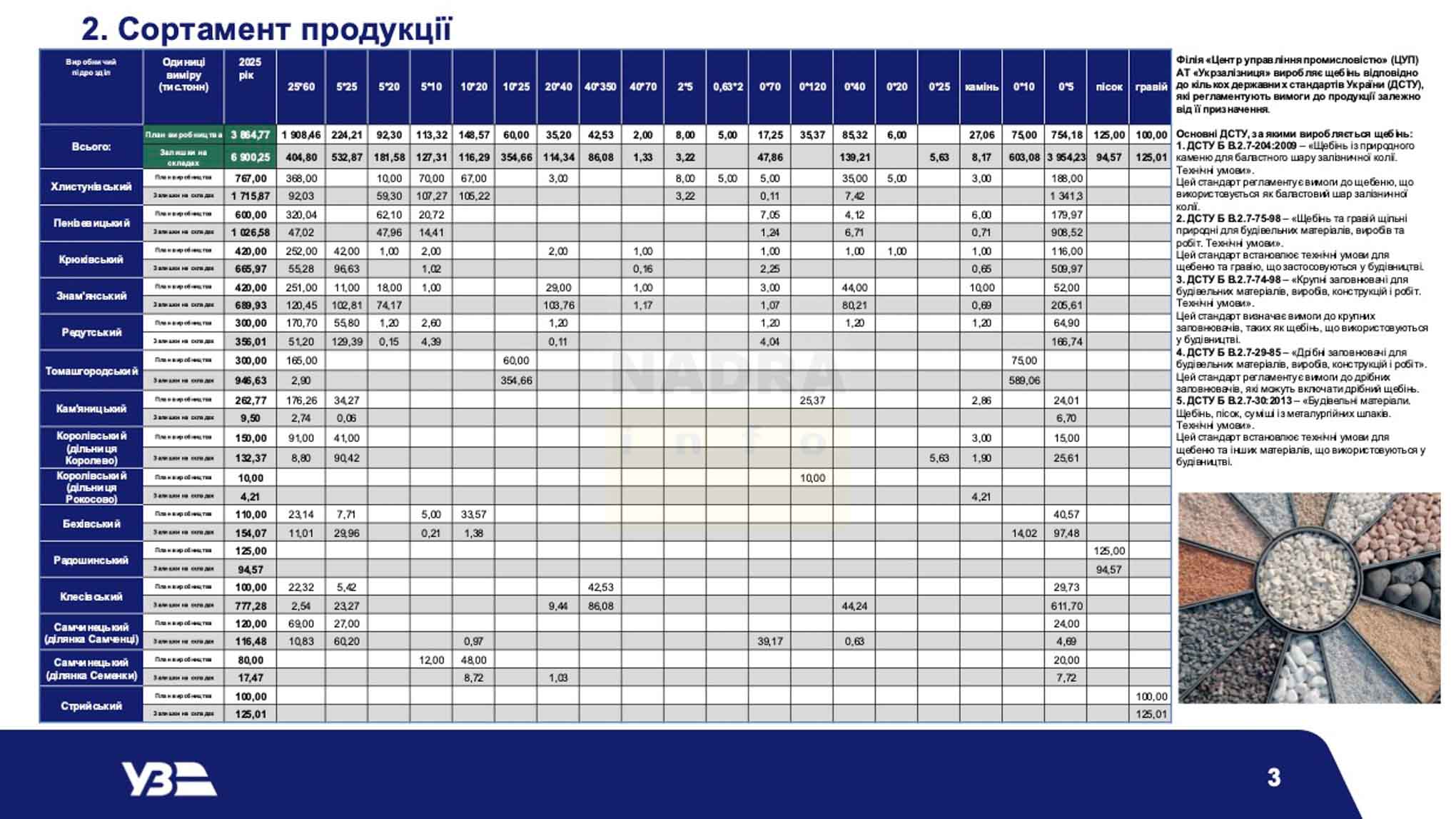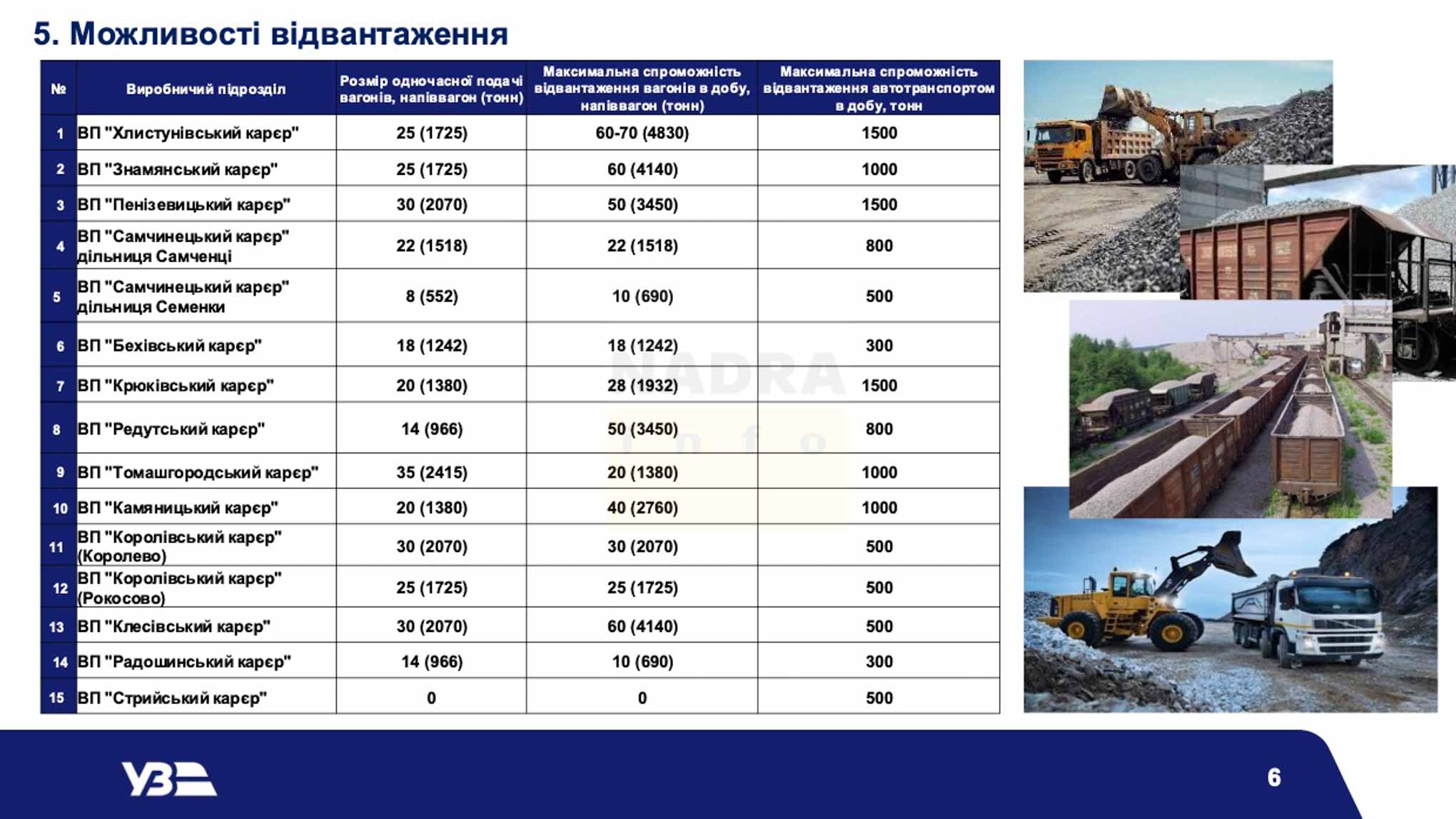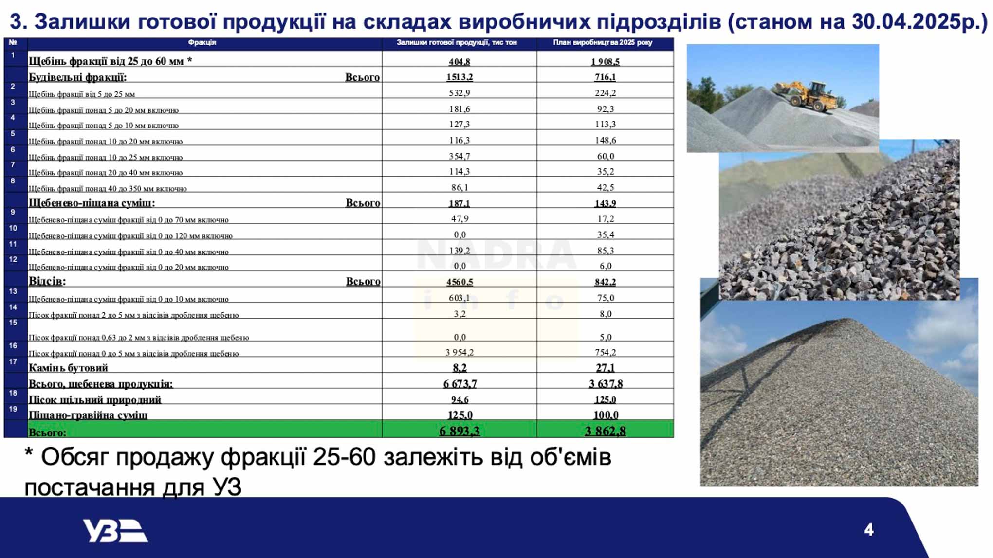 Крім цього, в Укрзалізниці повідомили, що станом на 30.04.2025 на складах виробничих підрозділів перебувало близько 6,9 млн тонн готової щебеневої і піщаної продукції, і розкрили дані про сортимент і можливості відвантаження продукції по кожному з працюючих карʼєрів компанії: