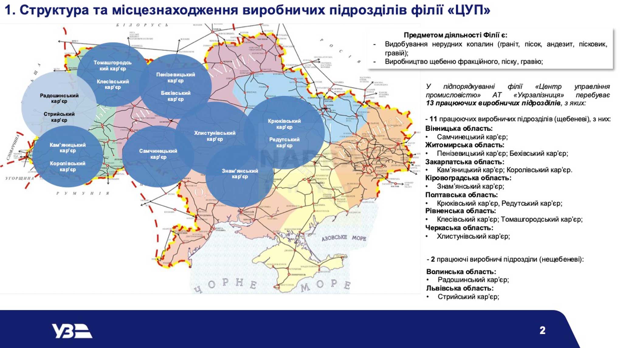 Станом на квітень 2025 р. користування надрами (видобування каменю, піску або підземних вод) здійснювали 13 виробничих підрозділів філії ЦУП.