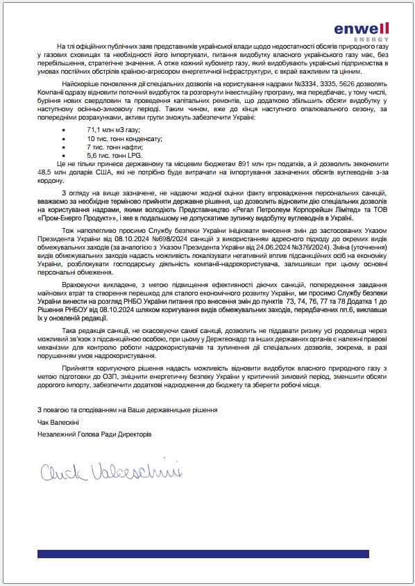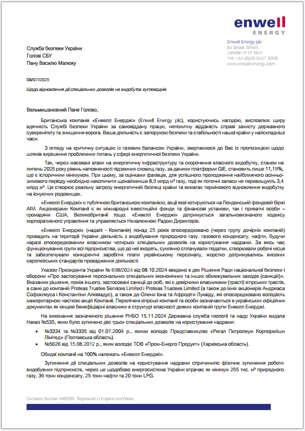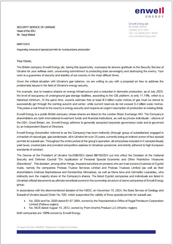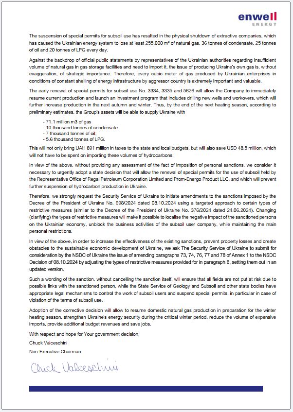 «Мова не про зняття санкцій, а про уточнення видів обмежувальних заходів. Це дозволить розблокувати діяльність газовидобувних підприємств Enwell Energy і використовувати іх на користь України, при цьому залишивши в повному обсязі санкціі до кінцевих бенефіціарних власників», – йдеться в повідомленні. Саме з цього приводу Enwell Energy звернулась до СБУ, оскільки Служба є ініціатором рішень, наслідком яких стала зупинка видобутку українського газу. І, з огляду на інтереси Українського народу, може стати ініціатором наступних рішень, які цей видобуток розблокують: