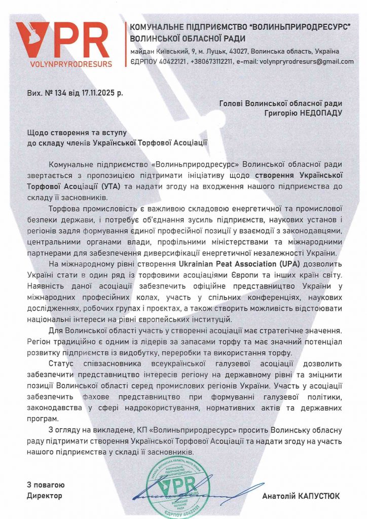 Також повідомляється, що 17.11.2025 КП «Волиньприродресурс» направило офіційний лист на ім’я голови Волинської обласної ради Григорія Недопада, яким просить підтримати ініціативу створення Української Торфової Асоціації та надати згоду на входження КП «Волиньприродресурс» до складу її засновників: