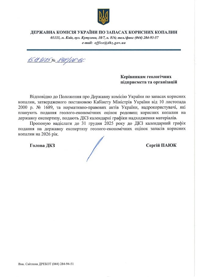 Державна комісія України по запасах корисних копалин (ДКЗ) повідомляє про формування графіку подання на розгляд ДКЗ матеріалів геолого-економічної оцінки (ГЕО) на 2026 рік.