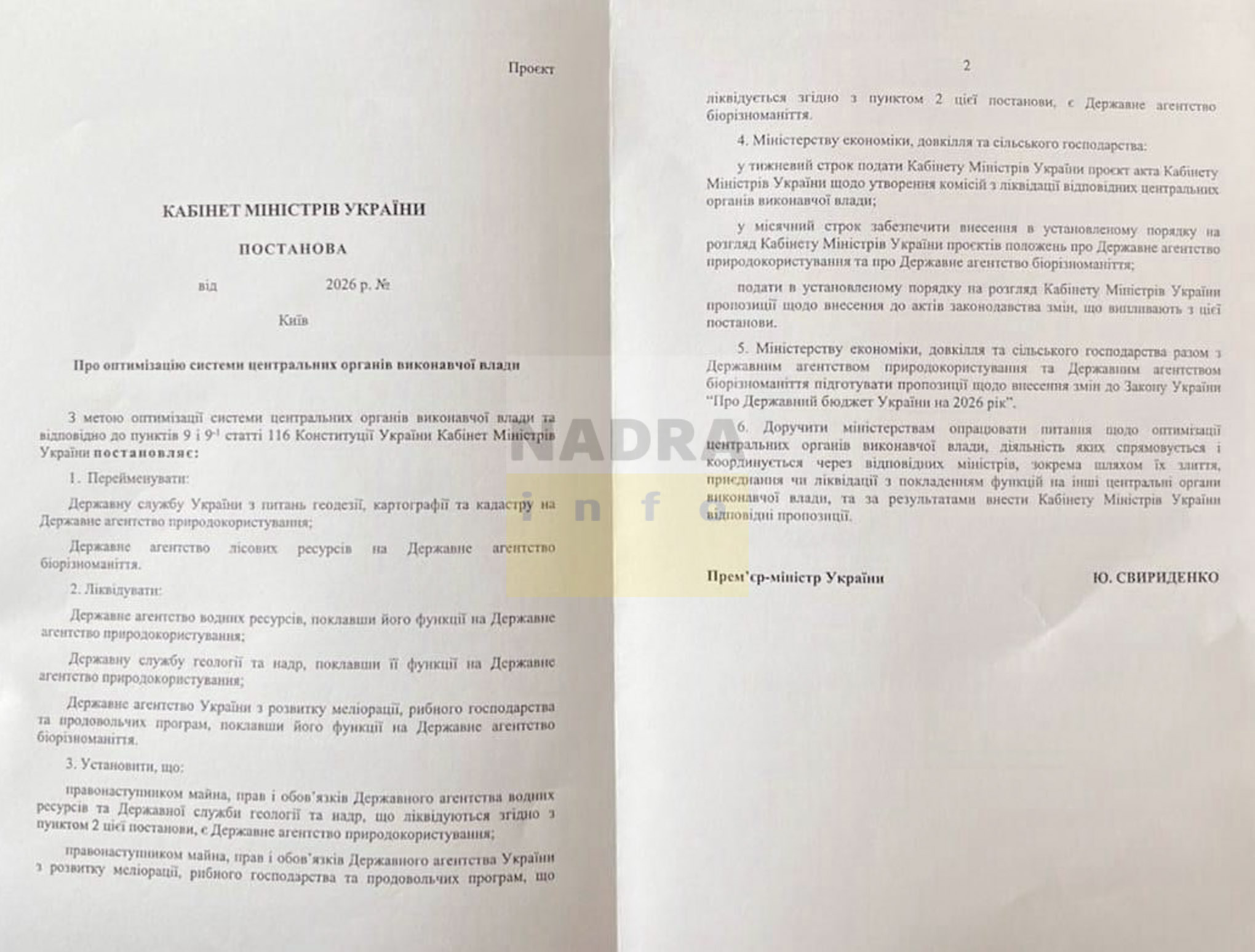 Текст [імовірно, робочої версії] документу, із копією якого вдалося ознайомитися NADRA.INFO, передбачає створення Державного агентства природокористування шляхом перейменування Державної служби України з питань геодезії, картографії та кадастру (Держгеокадастр) із покладенням на нього функцій Держгеонадр і Держводагентства (Державного агентства водних ресурсів, його також автори проєкту пропонують ліквідувати):