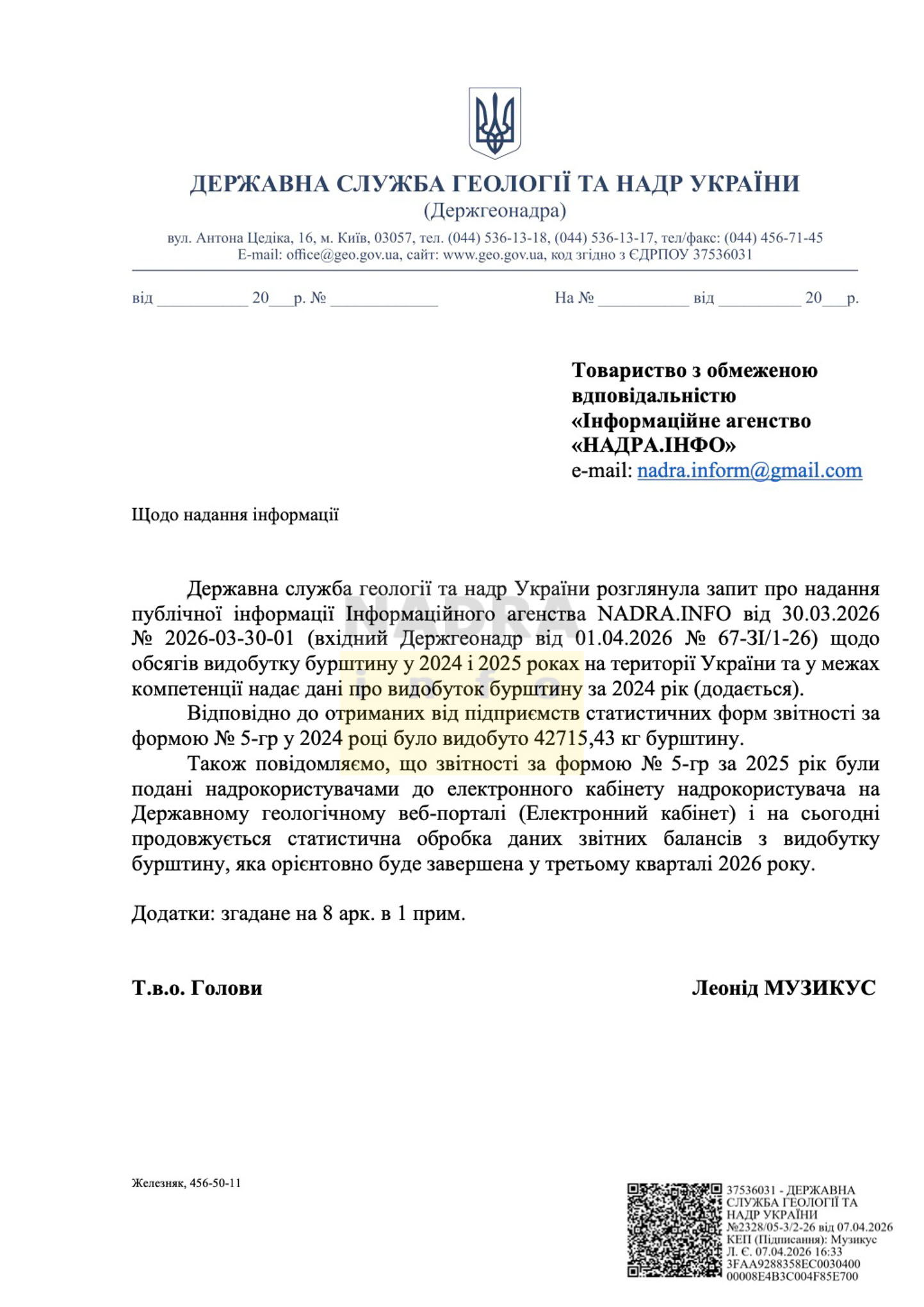 «Звітності за формою № 5-гр за 2025 рік були подані надрокористувачами до електронного кабінету надрокористувача на Державному геологічному веб-порталі (Електронний кабінет) і на сьогодні продовжується статистична обробка даних звітних балансів з видобутку бурштину, яка орієнтовно буде завершена у третьому кварталі 2026 року», – повідомив т.в.о. Голови Держгеонадр Леонід Музикус.
