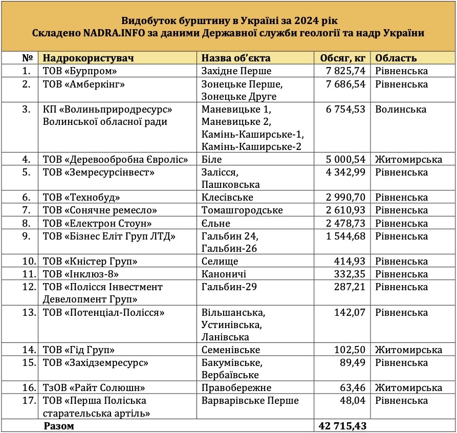 В 2024 р. в Україні 17 компаній-надрокористувачів видобули понад 42,7 тонн (42 715,43 кг) бурштину-сирцю. Про таке NADRA.INFO повідомили в Державній службі геології та надр України у відповідь на запит.