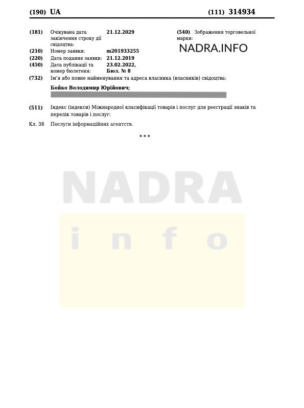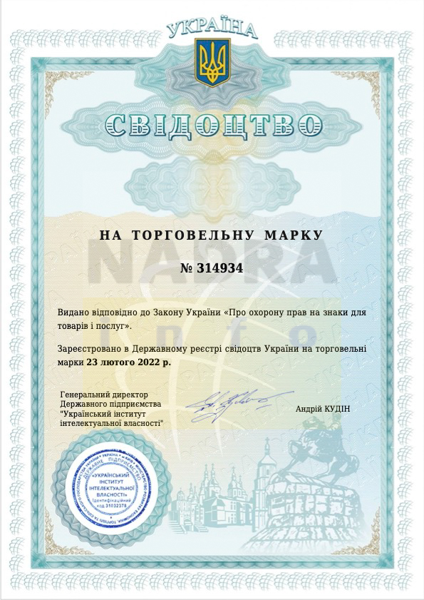 NADRA.INFO є зареєстрованим брендом (Свідоцтво на торговельну марку №314939 від 23.02.2022).